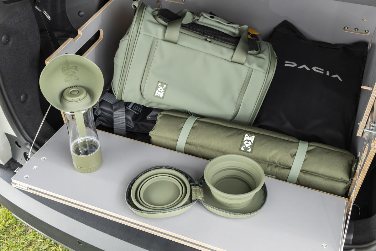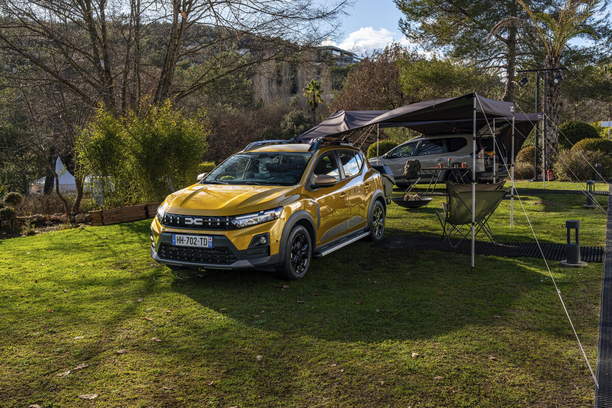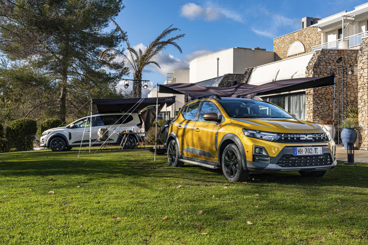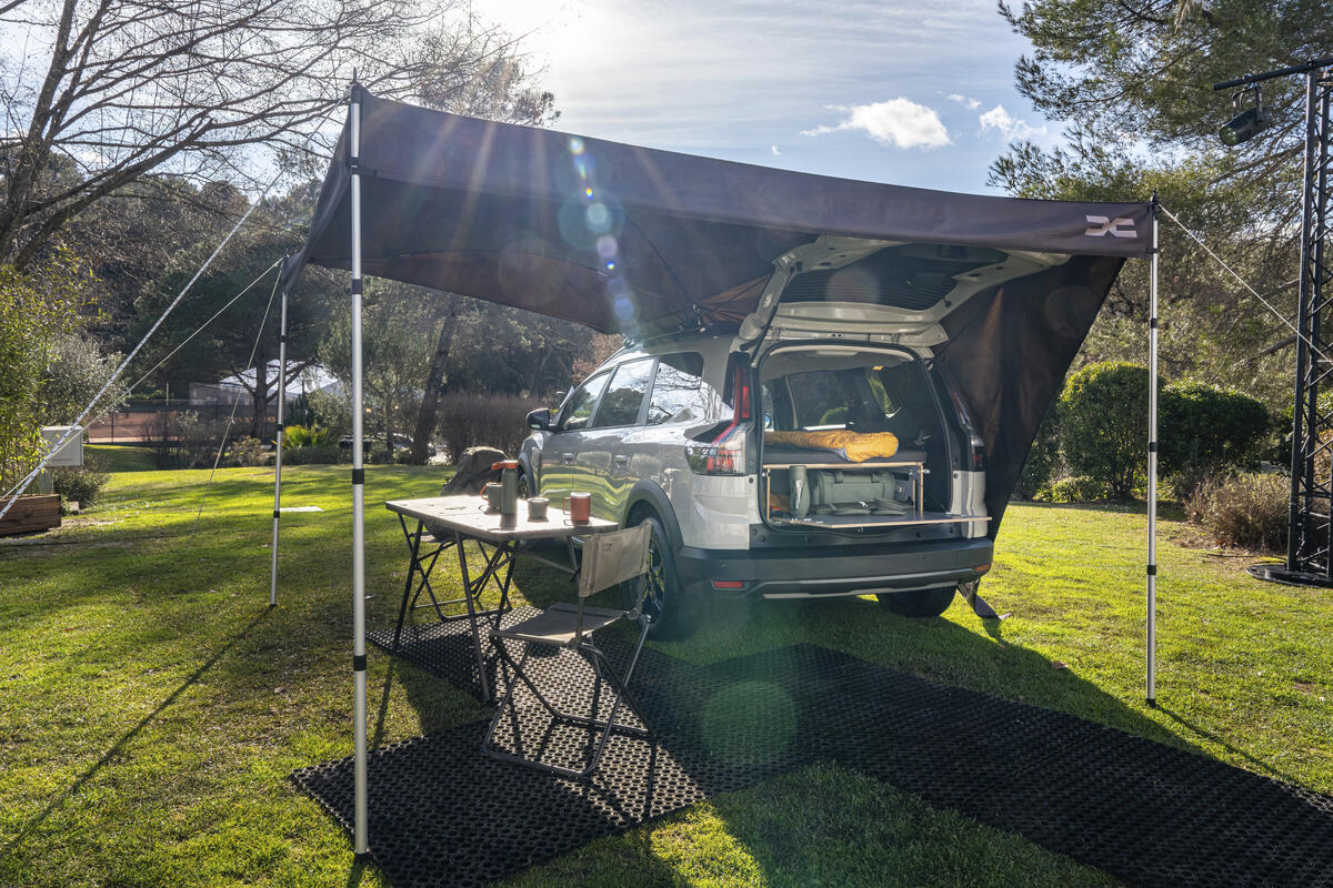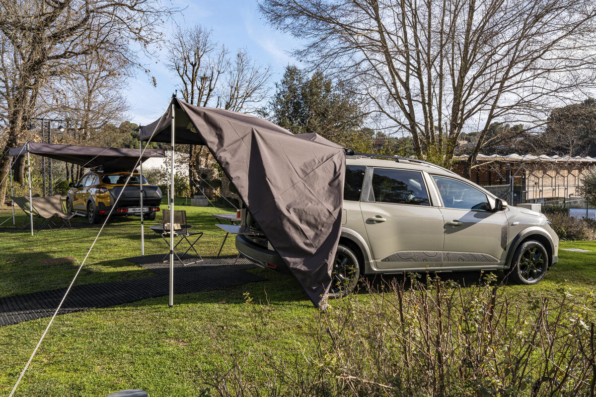 Für alle Modelle mit Längsdachträgern (Sandero Stepway, Jogger, Duster, Bigster) führt Dacia ein neues Zubehörteil ein: eine 3 × 3 Meter grosse Markise aus Segeltuch (40 Prozent recyceltes Material), die einen grossen überdachten Bereich bietet. Zwei Teleskopstangen erleichtern den Aufbau.